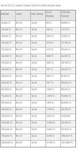 - Diğer vade oranlarına ek olarak, 60 ay vadeli esnaf kefalet kredilerinde birden fazla kesintiyle karşılaşılır. Bu kesintiler arasında; bölge birliği kesintisi, TESKOMB kesintisi, kooperatif istihbarat tutarı, ortak sermaye tutarı, banka komisyonu gibi kesintiler de yer alır. Yukarıda yer alan hesaplama tablosunda kesintiler baz alınmamıştır.
